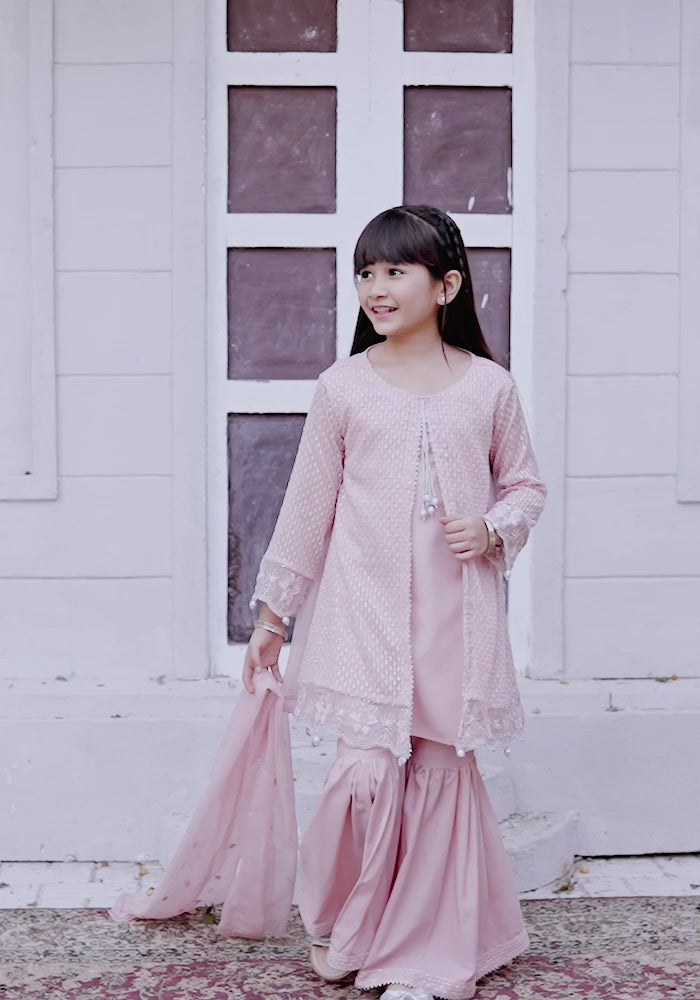 A dusky pink fully embroidered gorgeous three piece formal outfit, the top is stylized in a heavily embroidered coat style with an attached malai crepe inner with an elaborate silver dori and ball tassle tye on the neckline. The matching subltle pink and silver embroidered detailing on the daman and sleeves give a magical look to this elegant ensemble as it is paired with a raw silk dusky pink gharara delicately embroidered on the bottom. Completed with a chiffon all over embroidered dupatta, making this the perfect choice for your angel for any formal affair.