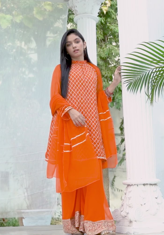 Top: Orange Chiffon Kurta Fully Embroidered with Laces, Stone Work, and Malai Crepe Lining Inside Bottom: Orange Chiffon Bell Bottom Pants with Embroidery and Malai Crepe Lining Inside Dupatta: Orange Chiffon Dupatta with Laces