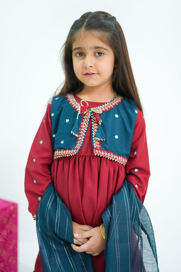 Top: Maroon Raw Silk Kurta & Teal Blue Raw Silk Koti With Embroidery