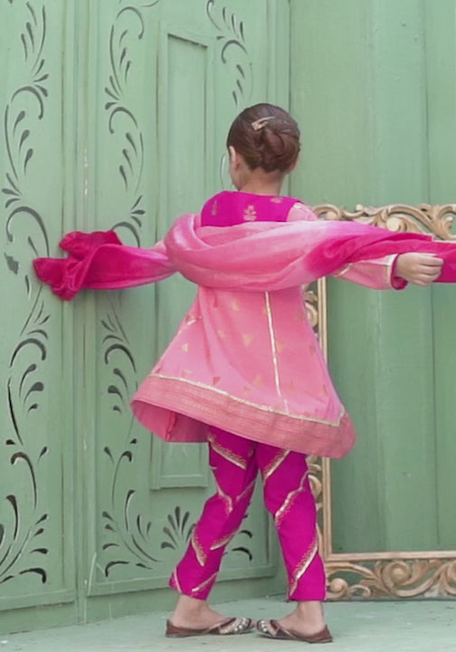 A rosy pink and gold jacquard kurta with gold applique embroidery and lace trimmings comes with an attached Malai crepe lining is stylized with a hot pink raw silk koti which is block printed in gold and accentuated with laces and a handmade tassel in the front. Paired with hot pink raw silk block printed trousers and a tie and dye silk dupatta is sure to steal everyone's heart as this elegant outfit is like a breath of fresh air for your wardrobe this festive season.