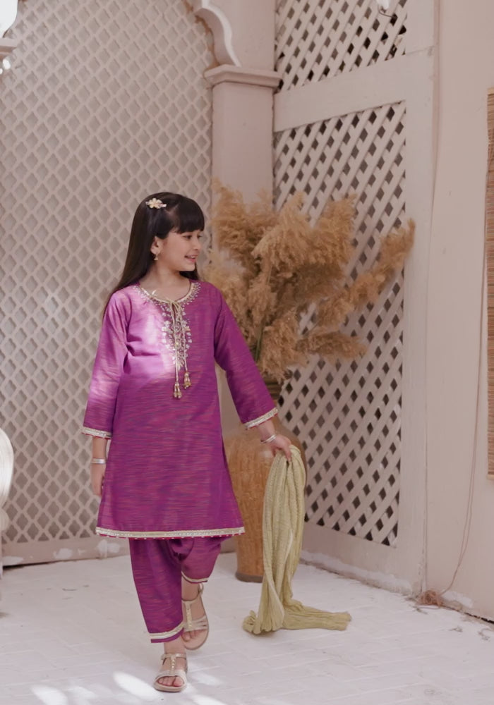 A grape purple multi yarn cotton kameez accentuated with shimmery gold hand adda work and a handmade gold tassle tye on the neckline. The gold laces on the sleeves, daman and on the matching trouser bottoms complete the winning look of this outfit as it is paired with a gold crush dupatta for the perfect look for your fashionista.
