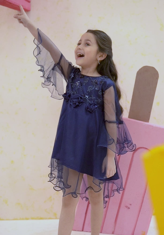 A divine navy blue sequin net dress with an attached malai crepe lining and bell shaped sleeves. The floral embelishments on the waist are the highlight of this cute number and is sure to make you fashionista sparkle wherever she goes wearing it.