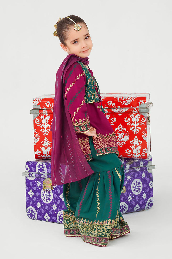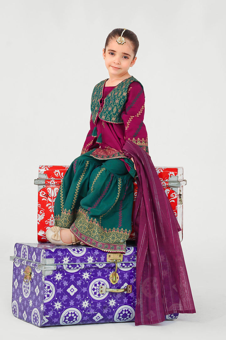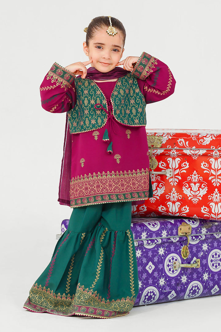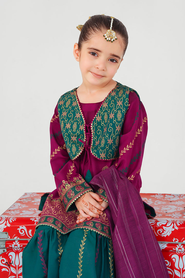 Top: Magenta Pink Raw Silk Kurta & Green Raw Silk Koti With Screen Print, Tassels and Gota Lace