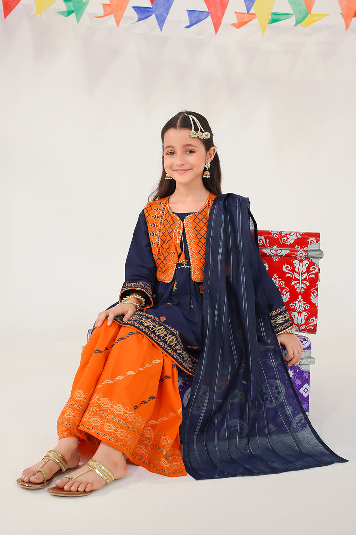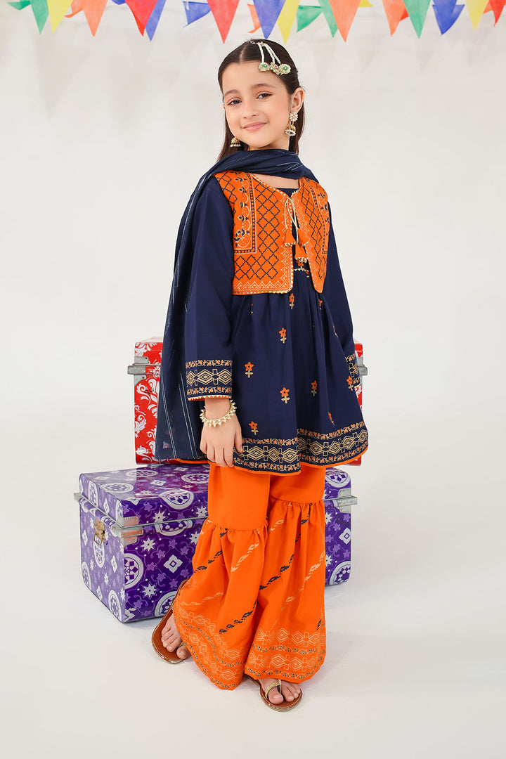 Top: Navy Blue Raw Silk Kurta & Orange Raw Silk Koti With Screen Print, Tassels and Gota Work
