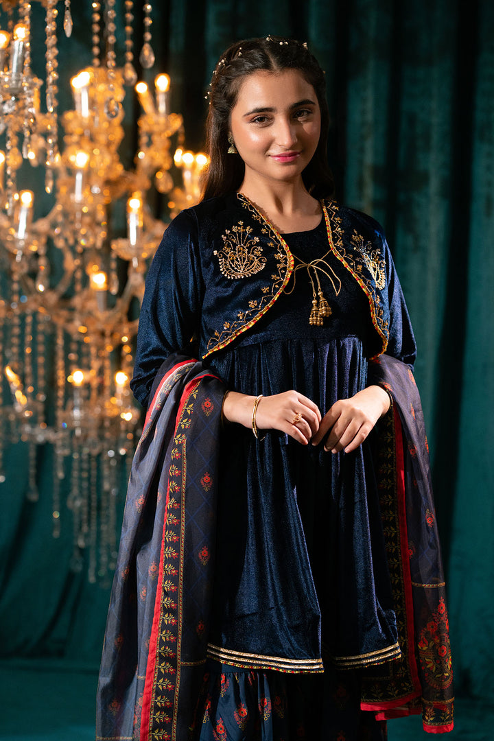Top: Navy Blue Velvet Kurta With Hand Adda Work On Koti, Gota Finishing and Tassels