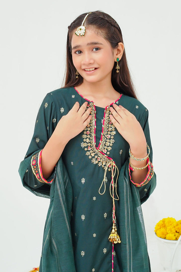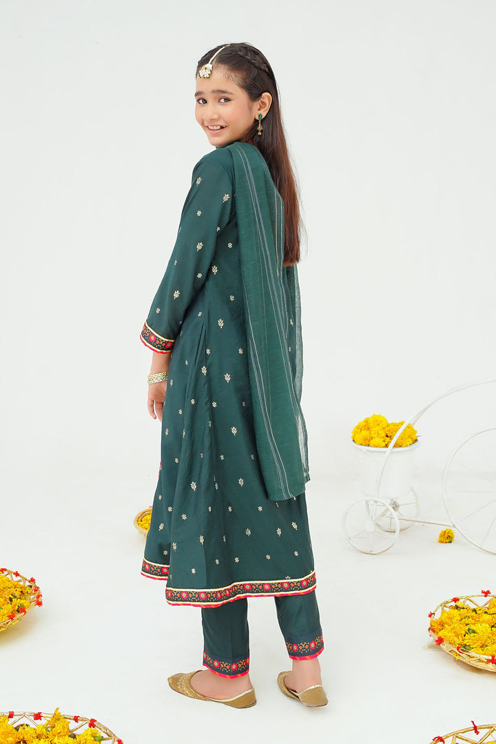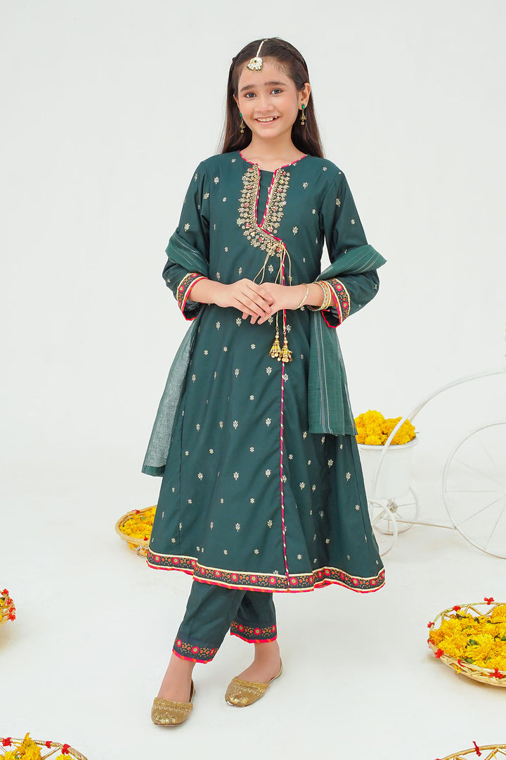 Top: Dark Green Jacquard Maxi With Hand Adda Work, Tassels and Digital Print